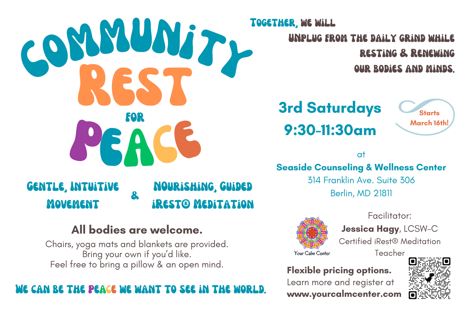 COMMUNITY CONNECTION: If you'd like to connect this Saturday, June 15, 9:30-11:30am, and gather in the spirit of rest and peace, I will be at Seaside Counseling & Wellness Center in Berlin, MD, ready to welcome you with open arms and guide you in a morning of connection and restoration. I hope to see you there.